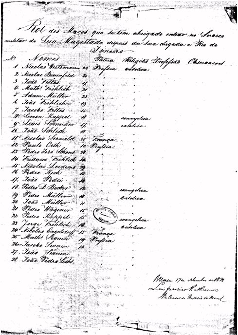 Durou a viagem até o Rio de Janeiro, 14 semanas e ali tivemos que esperar outras 14 por uma embarcação menor que nos trouxesse a Porto Alegre. Alguns moços que viajavam em nossa companhia, ficaram naquela cidade e se alistaram no exército brasileiro. Nós, porém continuamos a viagem para o Rio Grande onde chegamos após 14 dias e desta cidade seguimos depois de alguns dias de demora, a Porto Alegre e dali em lancha ao Porto dos Sinos, denominado Passo, hoje São Leopoldo, onde desembarcamos e nos dirigimos à Feitoria Velha, uma fazenda Imperial onde fomos acomodados em construções de madeira.